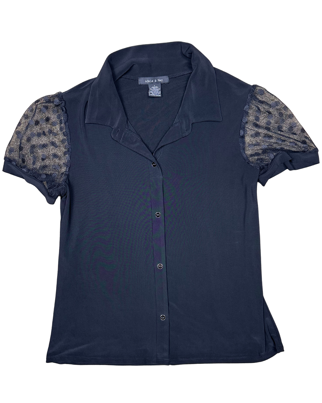 Adele & May black button-down blouse with sheer polka dot puff sleeves (large)